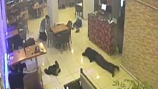 Görüntülerde bazı müşterilerin çatışmanın ortasında kaldığı görülürken, yaşanan panik ve müşterilerin kafeden kaçtığı anlar da görüntülere yansıyor. Bazı müşterilerinse yere yatarak masaların altına saklandıkları görülüyor.