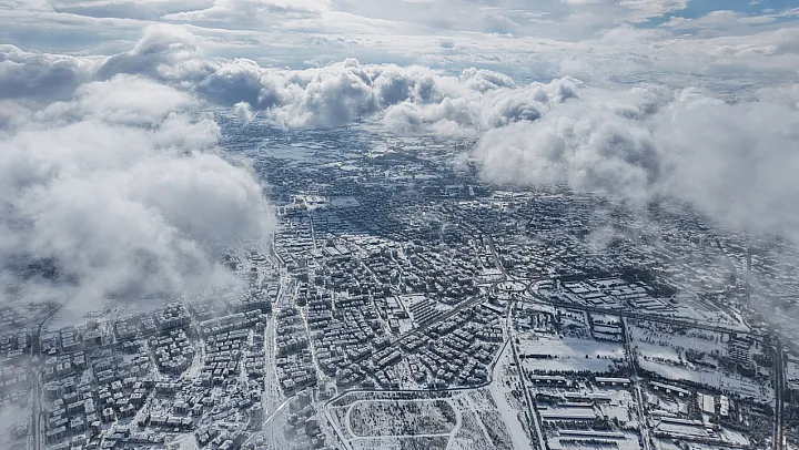 Harput'tan dron ile çekilen görüntülerde Elazığ kent merkezi karla birlikte beyaza büründü.