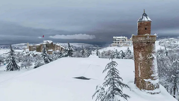 Elazığ'da etkili olan kar yağışıyla birlikte bin 200 rakımlı tarihi Harput Mahallesi tekrar beyaz gelinliğini giydi.