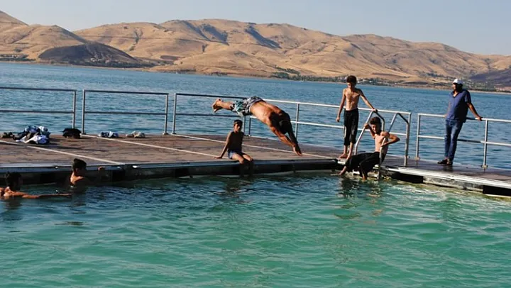 Elazığ'da Hazar Gölü içine yapılan yüzen havuz vatandaşlar tarafından büyük ilgi görüyor. Sıcaktan bunalan vatandaşlar, yüzen havuza koşuyor.