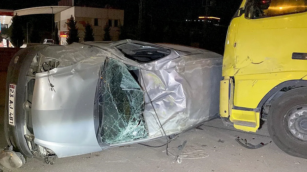 Plakası 23 AJ 481 olan hafif ticari araç, henüz kimliği öğrenilemeyen sürücüsünün kontrolünden çıkarak takla attı ve yol kenarında park halindeki tıra çarparak durabildi.
