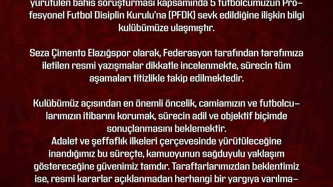 Elazığspor Kulübü’nden yapılan açıklamada, "Türkiye Futbol Federasyonu tarafından profesyonel liglere yönelik yürütülen bahis soruşturması kapsamında 5 futbolcumuzun Profesyonel Futbol Disiplin Kurulu’na (PFDK) sevk edildiğine ilişkin bilgi kulübümüze ulaşmıştır. Seza Çimento Elazığspor olarak, Federasyon tarafından tarafımıza iletilen resmi yazışmalar dikkatle incelenmekte, sürecin tüm aşamaları titizlikle takip edilmektedir. Kulübümüz açısından en önemli öncelik, camiamızın ve futbolcularımızın itibarını korumak, sürecin adil ve objektif biçimde sonuçlanmasını beklemektir. Adalet ve şeffaflık ilkeleri çerçevesinde yürütüleceğine inandığımız bu süreçte, kamuoyunun sağduyulu yaklaşım göstereceğine güvenimiz tamdır. Taraftarlarımızdan beklentimiz ise, resmi kararlar açıklanmadan herhangi bir yargıya varılmaması ve sürecin tamamlanmasının sabırla beklenmesidir. Gelişmeler, kulübümüz tarafından yakından izlenmekte olup, resmi bilgilendirmeler şeffaf biçimde kamuoyu ile paylaşılmaya devam edilecektir" denildi.