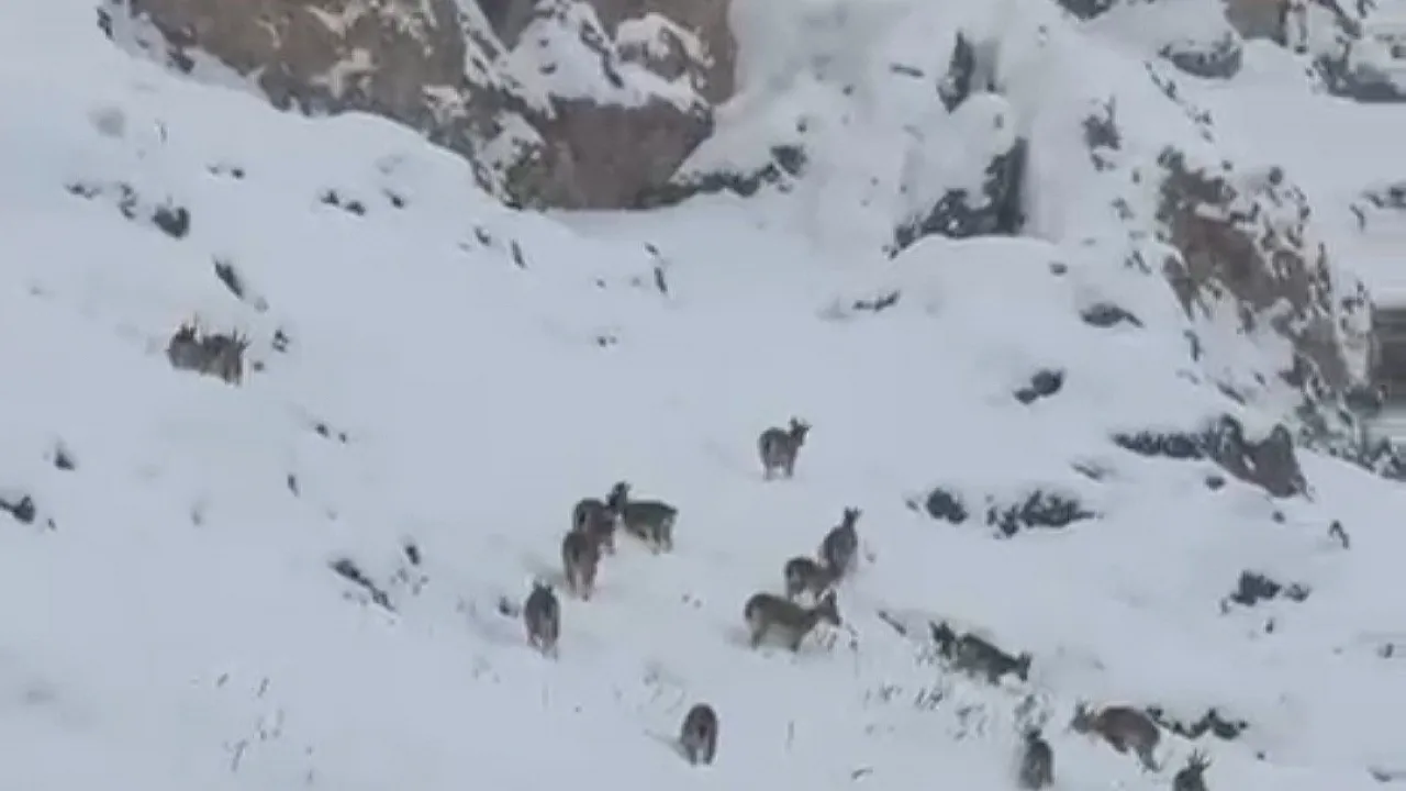 Elazığ'ın Palu ilçesinde bulunan Palu Kalesi'nde kar üzerinde otlayan dağ keçileri sürü halinde görüntülendi.