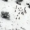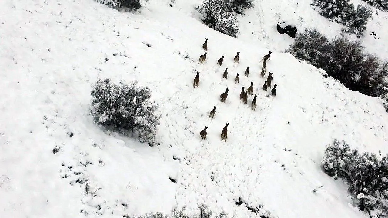Elazığ'ın Ağın ilçesinde nesli tükenme tehlikesi altında bulunan dağ keçileri, kar üzerinde yiyecek ararken dron ile görüntülendi.