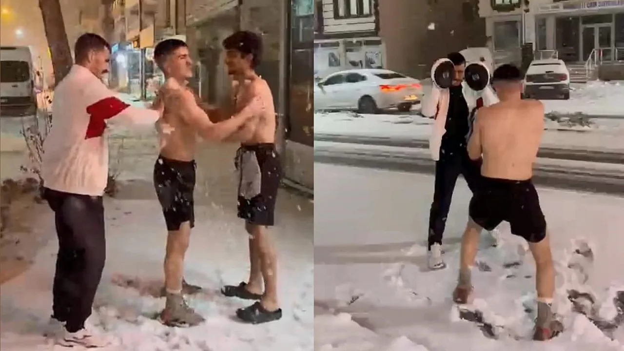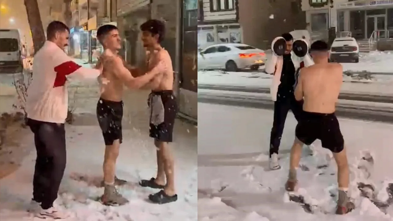 Elazığ’da milli boksör Yusuf Eren Yıldırım ve antrenörü Eyüphan Yıldırım, yağan karı fırsat bilerek açık havada yarı çıplak antrenman yaptı. Bir süre yağan karın altında çalışan ikili, daha sonra arkadaşlarının da katılımıyla yarı çıplak bir şekilde yerde bulunan karı vücutlarının belirli kısımlarına sürdü. O anlar ise arkadaşlarının cep telefonu kamerasına yansıdı.